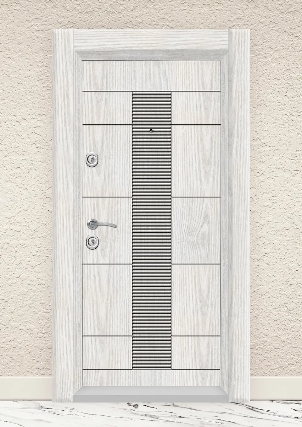 Крилото представлява два MDF панела по 10мм, между които има метален лист с дебелина 1.2мм. Крилото е с пълнеж за шумо и топлоизолация от минерална вата и е с допълнително метално оребряване. Панелът е с ламинатно покритие. Дебелината на крилото е 90мм. Лицевият и вътрешният панел са с красива фрезована шарка, като от вътрешната страна на вратата има допълнителен MDF елемент, който представлява рамка на MDF панела. По този начин се придава стилен и завършен вид на крилото. Има три пасивни шипа, които влизат в касата при затворено положение. За по-добра изолация са поставени и допълнителни гумени уплътнения.