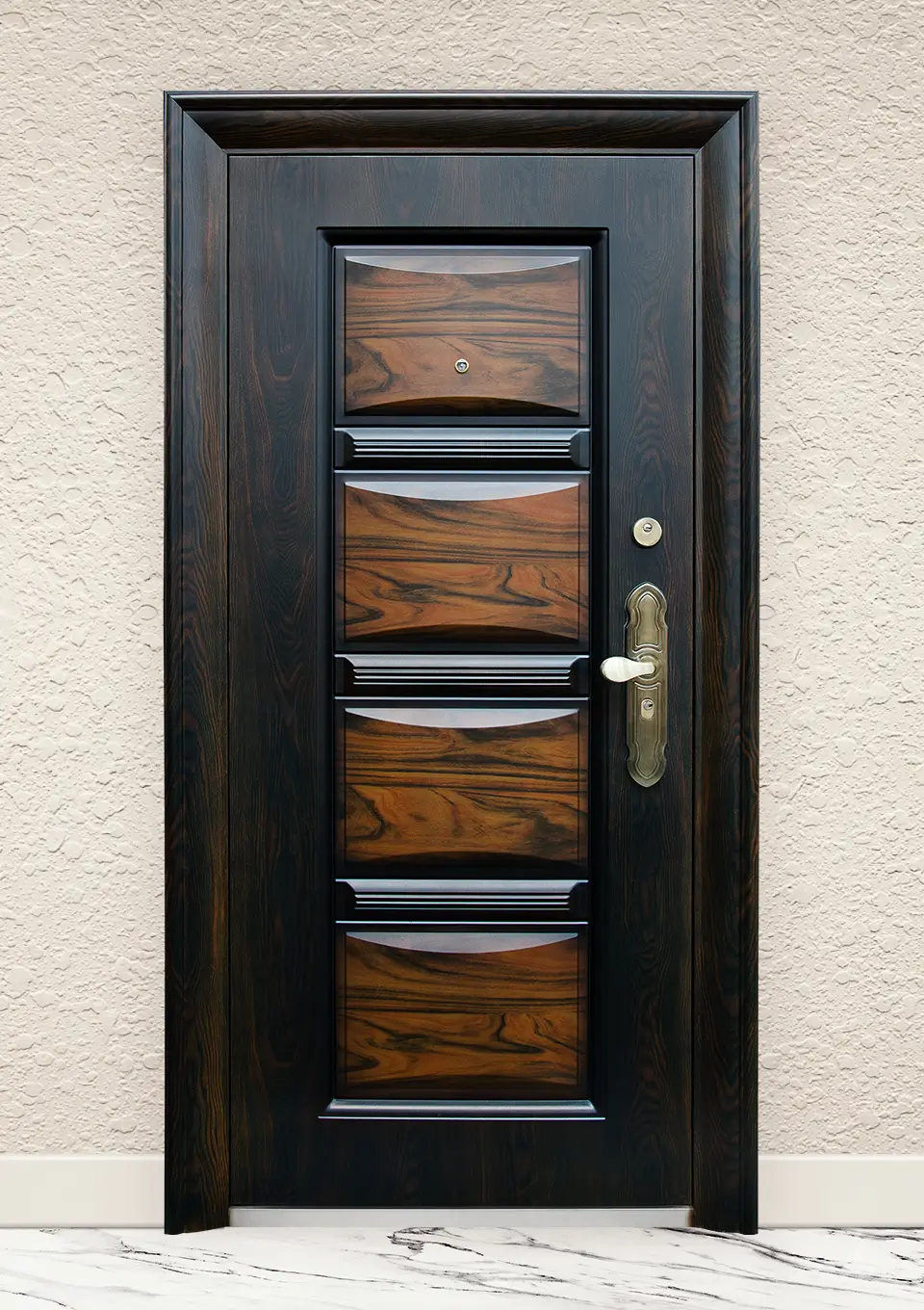 Крилото на вратата е изработено от два метални листа с релефна повърхност, допълнително оребрено с метални профили и поставена между тях изолация тип „пчелна пита”. Дебелината му е 70мм. Крилото е прахово боядисано. Моделът е с UV защита. Касата на вратата е метална с дебелина 90мм, прахово боядисана, с перваз само от едната страна. Заключването е тристранно, 12-точково. Бравата заключва вратата в три посоки – нагоре, надолу и в страни с 11 шипа, като има и вътрешна ключалка с един шип. Вратата се предлага в размер 90/197 см.*При размери на вратата 90/210 см и 96/200 см се доплаща допълнително.